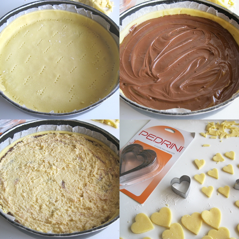 Facendo le allumettes mi è rimasta una considerevole dose di frangipane e ho cercato su internet finchè non mi sono imbattuta nella ricetta di Manuela del blog “La via delle spezie“. L’ho solo resa glutenfree. e ho omesso le mandorle perchè a casa mia non gradiscono. Ho preparato la frolla sabbiando farina, zucchero e burro, ho aggiunto i tuorli e il pizzico di sale. Ho lavorato la pasta finchè non è diventata omogenea e compatta. Per il frangipane ho lavorato con le fruste il burro ammorbidito con lo zucchero a velo e ho versato la farina di mandorle. Ho aggiunto a filo le uova leggermente battute e poi con la spatola ho incorporato la farina. Ho steso la pasta frolla su di un foglio di carta forno che ho ritagliato a disco di misura un pò più grande della tortiera (da 24cm), l’ho bagnato, strizzato e asciugato. Ho ritagliato l’eccesso di pasta e adagiato il disco di frolla con la carta forno nella tortiera. Ho bucherellato il fondo e ricoperto con circa 250 gr. di nutella livellandola. Ho coperto la nutella con il frangipane livellandolo per bene (ma non ci sono riuscita benissimo perchè il mio frangipane era stato in frigo e non era molto fluido). Con la frolla rimasta ho intagliato dei cuoricini usando gli stampini gentilmente inviatimi da Pedrini. Ho ricoperto la crostata con i cuoricini e ho infornato a 180° per 35 minuti. Fare totalmente raffreddare e poi togliere dallo stampo. E’ buonissima! grazie Manuela 🙂