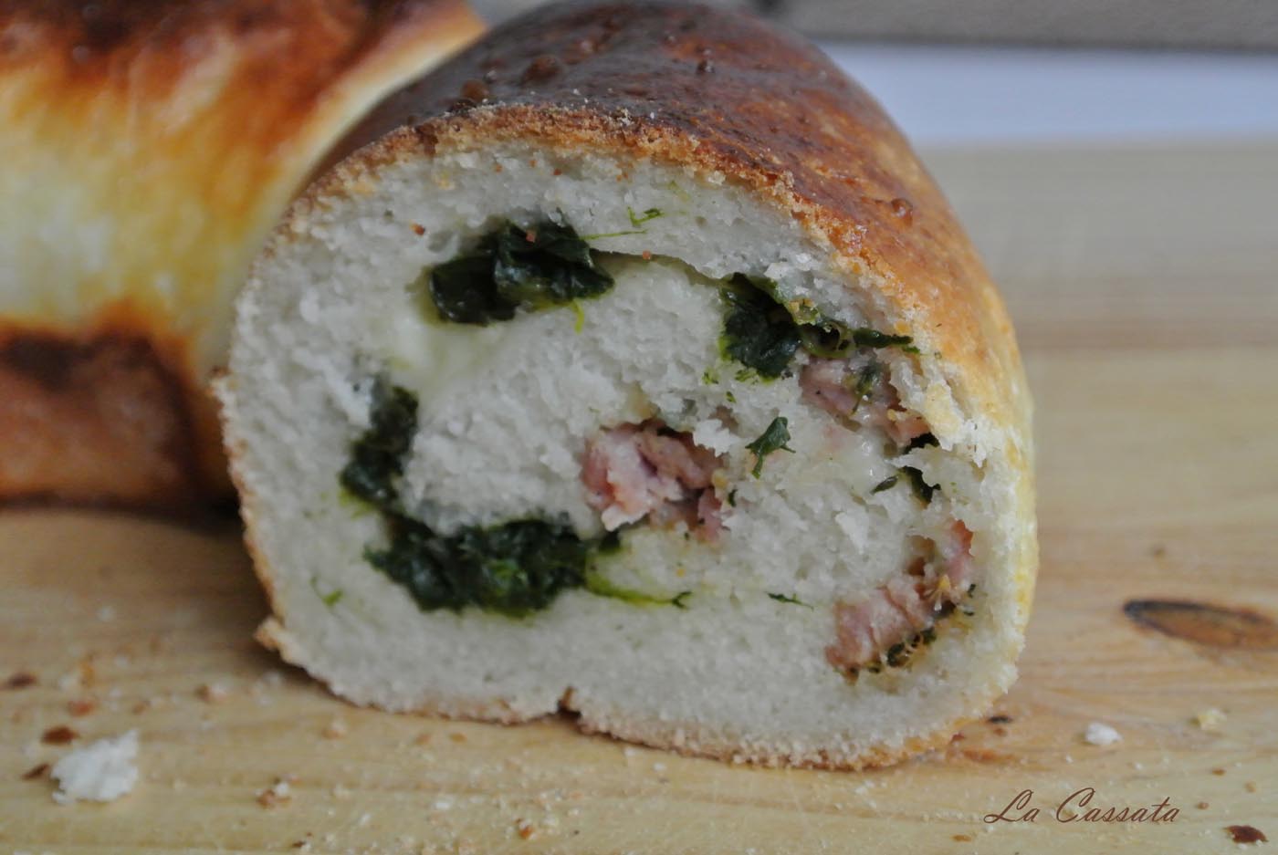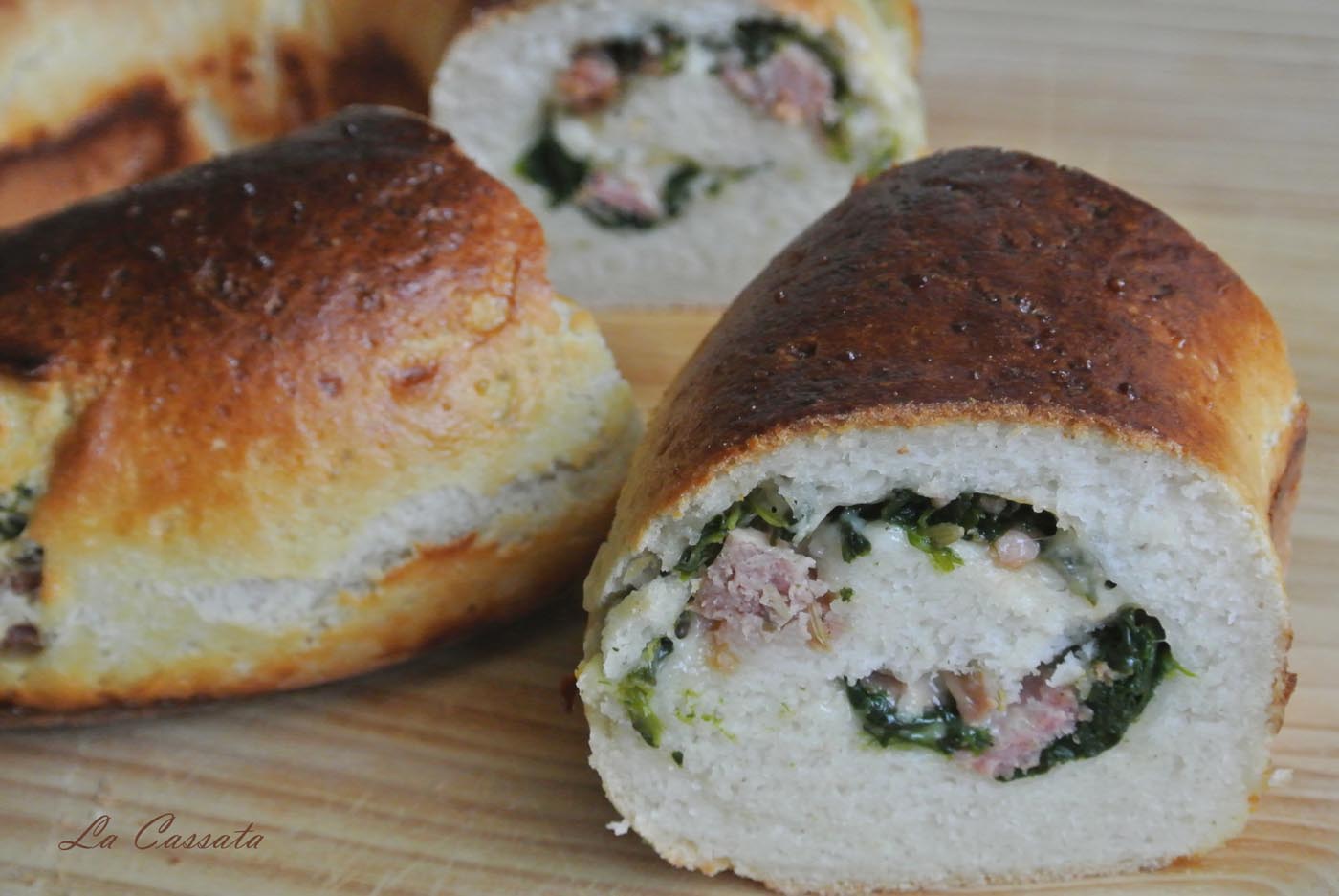 Ho scaldato il latte perchè diventasse tiepido e ho fatto sciogliere al suo interno sia il lievito che lo zucchero. Ho versato le farine e il latte in polvere e ho iniziato ad impastare con la planetaria. Solo alla fine ho aggiunto olio di girasole e sale. Ho lasciato che venisse assorbito dall’impasto, ho coperto e ho lasciato lievitare fino al raddoppio. Ho steso l’impasto sul piano di lavoro spolverizzato di farina (per me senza glutine MIx It! Schaer) e ho spolverizzato con caciocavallo grattugiato, spinaci lessati e strizzati benissimo e salsiccia fresca cotta e raffreddata. Ho aggiunto dei cubetti di fontina, ripiegato i bordi e arrotolato la pasta, ottenedo un cordone che ho adagiato nello stampo per ciambella antiaderente della Guardini linea Keramìa. Oltre ad essere delizioso da vedere è perfettamente antiaderente e facilissimo da pulire, non necessita di essere imburrato e infarinato. Ho lasciato lievitare ancora la corona e poi l’ho pennellata con tuorlo battuto. Ho infornato a 180° per 25 minuti. E’ squisita!