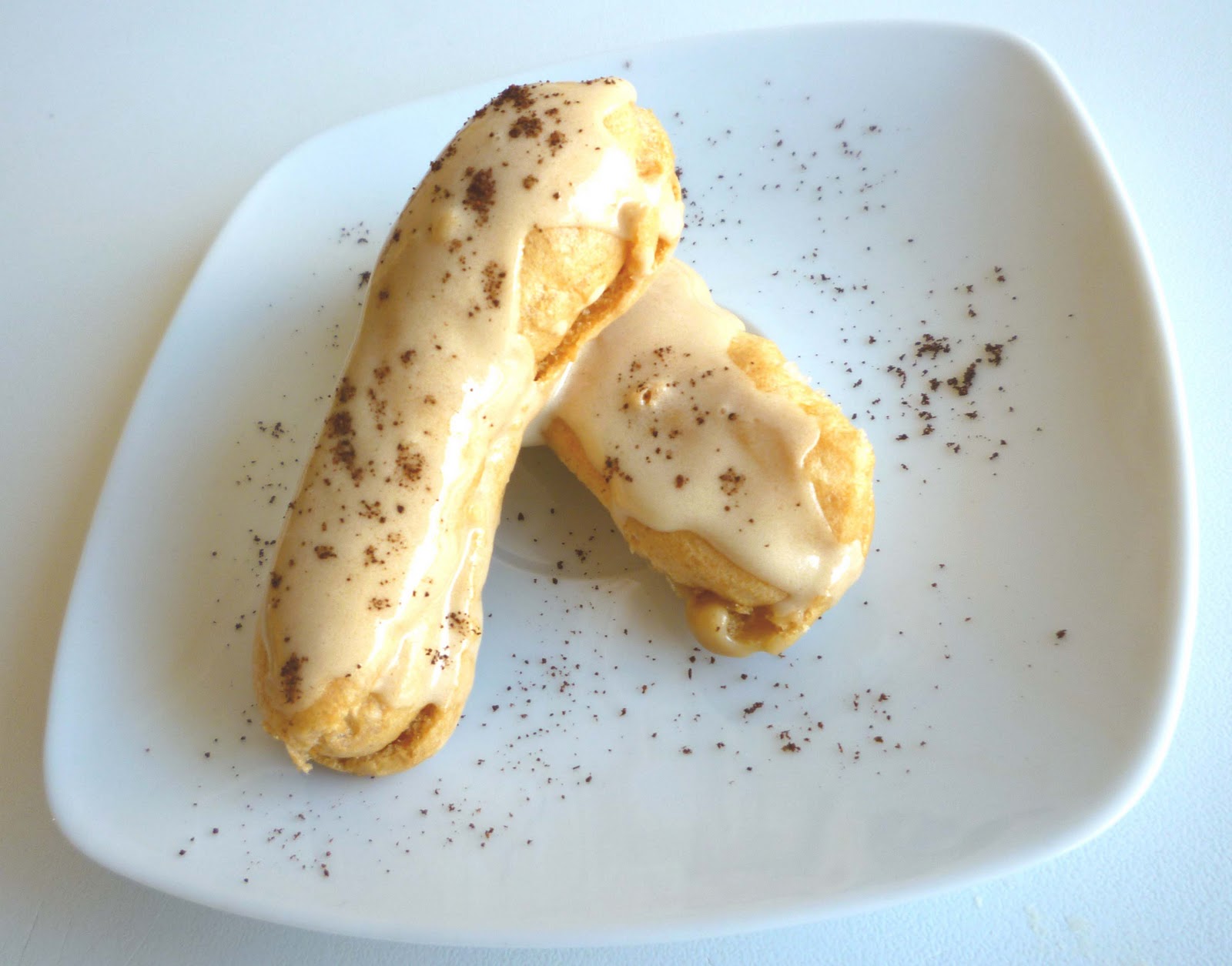La mia versione è glutenfree e la ricetta originale senza glutine l’ho presa dalle ragazze del forum di Cucina in Simpatia e cioè qui. Ho inizialmente preparato la pasta bigné, facendo bollire l’acqua e il burro, aggiungendo la farina (io ho usato il mix di farine. – 290 gr. farina di riso e 130 fecola – da cui ho prelevato i 150 gr. della ricetta) e mescolando finché non diventa una palla. Dopo averla fatta raffreddare qualche minuto, ho aggiunto un uovo alla volta mescolando di continuo. Con l’aiuto di un sac à poche, ho fatto delle piccole strisce sulla placca coperta da carta forno e ho infornato in forno già caldo a 200° per 25 min. (nel mio forno; nel vostro controllate dopo 20 min.). Li ho messi a raffreddare. Qualche ora prima avevo preparato la crema pasticcera al caffè. Ho messo i chicchi di caffé in un sacchetto da congelatore e li ho schiacciati per bene. Ho messo latte e panna in un pentolino e ho aggiunto i chicchi schiacciati, portando tutto ad ebollizione. Ho spento e ho lasciato riposare per circa 20 min. Nel frattempo ho sbattuto i 3 tuorli con lo zucchero e poi ho aggiunto la maizena e infine ho versato latte e panna filtrati. Ho rimesso sul fuoco e ho fatto addensare. Ho versato la crema ottenuta in una ciotola, l’ho coperta con pellicola e ho fatto raffreddare bene. Ho tagliato gli éclairs a metà e li ho farciti con la crema, aiutandomi con un sac a poche. In una ciotola ho mescolato l’albume con zucchero a velo (ho fatto un pò ad occhio, finchè non è venuta fuori una glassa nè troppo liquida nè troppo densa) e ho aggiunto mezza tazzina di caffé. Poichè la glassa si è allentata, ho aggiunto un altro poco di zucchero a velo. Ho guarnito gli éclairs con la glassa e li ho spolverizzato con pochissimo caffé macinato. Li ho riposti in frigo e serviti un’ora dopo. Si conservano benissimo anche il giorno dopo, rimanendo croccanti.