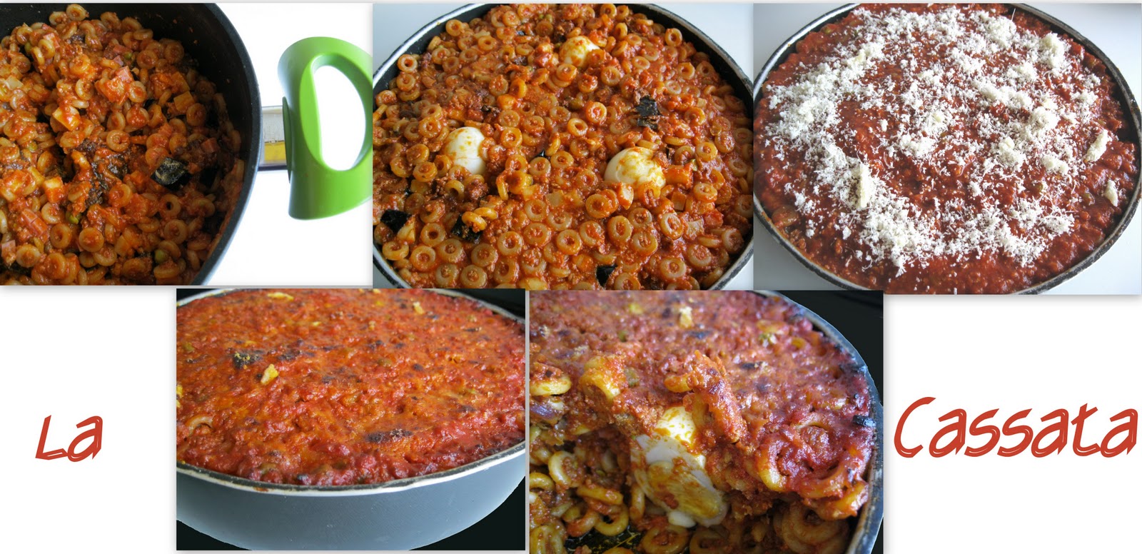 Questa si che è una tipica preparazione siciliana:-) Piatto ricchissimo che prende il nome dal “cacio” col quale è abbondanemente condito. Io inizio la sera prima preparando il ragù, così l’indomani mi resta ben poco da fare. Soffriggo una grossa cipolla, una carota e un gambo di sedano frullati in un poco di olio d’oliva. Aggiungo il tritato (500 gr. suino, 500 gr. vitello), mescolo, aggiungo 2 dadi, un poco di pepe e sfumo con del vino (rosso o bianco a seconda di quale ho sotto mano). Verso una generosa manciata di pisellini finissimi e continuo la cottura qualche minuto. Infine aggiungo il contenuto di due barattoli da 440 gr. di concentrato di pomodoro. Mescolo ancora e allungo con circa 2 lt di acqua. Mescolo, abbasso la fiamma al minimo e faccio cuocere per 2 ore e anche più. L’indomani taglio la melanzana a cubetti e li friggo. Nel frattempo faccio cuocere gli anelletti per la metà del tempo di cottura consigliato sulla confezione. Scolo la pasta, la rimetto in pentola (quella della foto è della linea Greenline Ballarini) e la condisco generosamente col ragù. Aggiungo cubetti di formaggio (avevo provola piccante, scamorza e emmenthal),cubetti di prosciutto cotto, caciocavallo grattugiato (una bella manciata), la melanzana fritta e verso il tutto in una teglia capiente. Adagio le tre uova sode sgusciate tra la pasta a casaccio (se a tutti i commensali piacciono le uova sode, potete tagliarle a cubetti e mescolarli alla pasta), copro tutta la pasta con altro ragù, spolverizzo con altro caciocavallo grattugiato e inforno a 200° per 30 minuti. Fare riposare la pasta circa un’ora prima di servire.