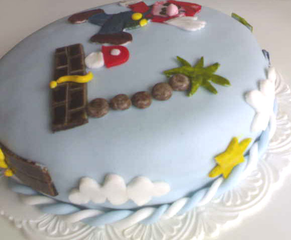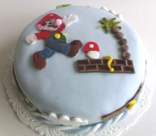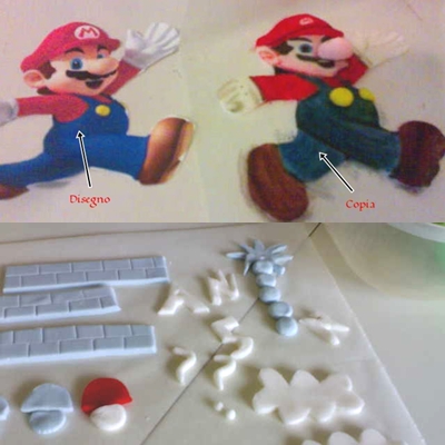Ho iniziato un paio di giorni prima facendo la pasta di zucchero e il giorno prima preparando tutto il necessario per poi assemblarla all’ultimo minuto. Ho preparato per prima cosa la base, montando gli albumi con 80 gr. di zucchero, poi ho montato i tuorli con 6 cucchiai di acqua bollente e quando hanno cominciato a schiumare ho versaro 160 gr. di zucchero e ho continuato a usare la frusta finchè non ho ottenuto una crema gonfia e ben strutturata. A quel punto ho versato i tuorli sugli albumi e mescolato con delicatezza. Ho diviso l’impasto a metà. Ho setacciato le farine (usando il famoso mix di farine: 290 gr. farina di riso, 80 gr. fecola, 50 gr. maizena. Da questo mix prelevo i 150 gr. che servono alla ricetta) e ne ho aggiunto metà ad una delle due parti di impasto, mescolando con molta delicatezza per non smontare la massa. All’altra metà ho aggiunto anche 30 gr. di pistacchi tritati, oltre alla farina. Ho imburrato e infarinato due teglie da 22cm e ho cotto in forno a 180° per 20 min. Ho lasciato freddare, mentre preparavo la crema pasticcera. Ho mescolato 3 tuorli con lo zucchero, la maizena e l’amido di riso (io non l’ho trovato e al suo posto ho usato la farina senza glutine Schaer mix C), ho mescolato bene e poi ho diluito con latte e la panna bollenti. Ho rimesso sul fuoco e ho mescolato finchè la crema non si è addensata. Io l’ho aromatizzata con qualche goccia di aroma limone. Ho coperto con pellicola e ho fatto freddare del tutto. L’indomani ho montato la panna rimasta e ne ho incorporato circa 300 grammi alla crema pasticcera (che ho tenuto in frigo). Battere bene la crema con una frusta così che ritrovi l’originale cremosità e diventi liscia. Incorporare la panna e aggiungere le fragole lavate, asciugate e tagliate a pezzetti piccoli. Ho preparato uno sciroppo comune (pari peso di acqua e zucchero portati a bollore) che ho aromatizzato col limone, ho tagliato la base di pan di spagna bianco in due strati. Ho poggiato il primo strato sul piatto di portata, l’ho inzuppato con lo sciroppo, ho coperto con una metà della crema. Ho adagiato il pan di spagna ai pistacchi (che era molto più basso del primo), l’ho inzzupato con lo sciroppo e coperto con la seconda parte della crema. Ho infine adagiato l’ultimo strato di pan di spagna bianco, ho premuto bene con i palmi per livellarlo e l’ho inzuppato di sciroppo. Con la panna montata rimasta ho ricoperto tutta la torta, bordi compresi. Ho ricoperto la torta con fondant colorato di azzurro e, aiutandomi con un ritaglio stampato su carta, ho ritagliato la sagoma di Mario e l’ho dipinta con i coloranti alimentari in polvere diluiti con poca acqua. In verità Mario l’ho preparato la sera prima per far si che si asciugasse bene. La mattina stessa dell’assemblaggio ho ritagliato tutti i disegni (idea presa sempre da internet) e li ho colorati prima di attaccarli alla torta. Basta inumidire leggermente la parte e appoggiare i ritagli. Per lucidare la torta si passa un pennello inumidito sulla superficie. Tenere in frigo fino al momento di sevire.