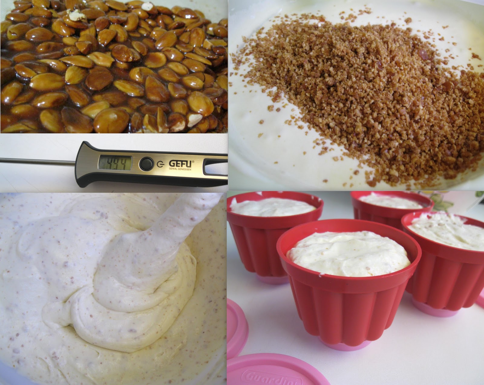 Ho iniziato giorni prima pelando le mandorle (non meno di un’ora!!) e poi tostandole nel forno (Montersino non lo ha fatto). L’altra sera le ho caramellate. Ho portato a 119° lo zucchero e l’acqua (ho usato il termometro vinto nel contest di Araba Felice…grazie Arabé) e poi ho versato in casseruola le mandorle riscaldate in microonde, ho mescolato con una paletta finchè lo zucchero non è diventato di un bel colore caramello. Ho aggiunto una noce di burro e ho mescolato facendola sciogliere. Montersino usa il burro di cacao che impedisce alle mandorle di ammassarsi tra loro formando un’unico blocco. Io non l’ho trovato e ho provato a sostituirlo così, ma se ha scelto il burro di cacaco al posto del burro ci sarà stato un motivo e ora lo conosco anche io. Si sono ammassate tutte, ma erano facilmente frammentabili, quindi nulla di grave 🙂 Ho versato il composto incandescente su un tappetino di silpat e l’ho lasciato raffreddare tutta la notte. L’indomani ho inserito le mandorle spezzettate nel mixer e le ho mixate riducendole in polvere. Non vi dico il profumo! In seguito mi sono dedicata alla preparazione della base semifreddo. Ho versato i tuorli d’uovo nella ciotola della planetaria con l’accessorio frusta e ho iniziato a montare a bassa velocità mentre cuocevo lo sciroppo di zucchero a 121°. Ho usato anche stavolta il termometro della Arabella che è nu bijou! Ho versato a filo lo sciroppo sui tuorli e aumentato la velocità perchè montassero e raffreddassero il più possibile. Ho usato 330 gr. di base semifreddo (cioè tutta) e l’ho mescolata alla pasta di mandorle. Sono mandorle omogeneizzate e rese fluide da usare di solito per i gelati o per le bevande. Come dice Montersino, serve ad esaltare il sapore di mandorla del parfait. Ho aggiunto 100 gr. di polvere di mandorle pralinate e mescolato ancora. Infine ho versato questo composto sulla panna montata (ma non troppo montata), ho mescolato bene e versato negli stampini monoporzione di Guardini, che sono deliziosi e pratici. Va conservato in congelatore per non meno di 4 ore prima di essere servito. Quello che rimane sta in congelatore anche per un mesetto. Servire irrorando con cioccolato fondente fuso in un poco di latte caldissimo. E’ buonissimo! Grazie Luca Montersino :-))