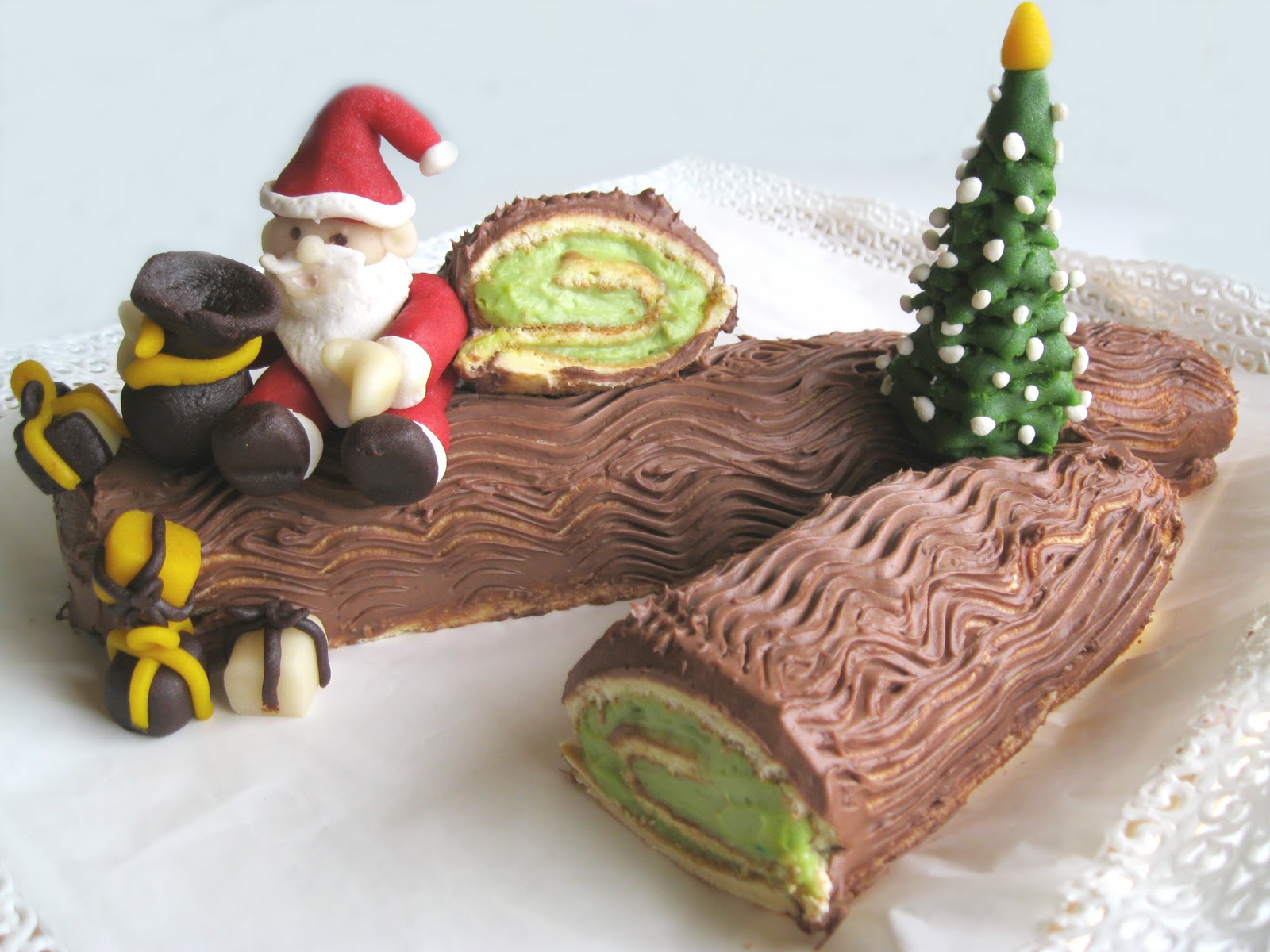 Per la base: montare bene i tuorli con le uova intere e i 110 gr. di zucchero; montare bene gli albumi con i 15 gr. di zucchero. Aggiungere delicatamente le farine setacciate alla massa di tuorli e zucchero e poi gli albumi. Stendere una metà dell’impasto in uno strato sottile su di una placca da forno ricoperta di carta forno e cuocere per 5 min. a 250°. Ripetere l’operazione con l’altra metà. Nel frattempo preparare la crema lavorando con le fruste il mascarpone e il latte condensato (se volete potete aggiungerne di più o di meno in base ai vostri gusti). Dividere i tre parti la crema e aggiungere rispettivamente la crema di pistacchi, la nutella e il cacao amaro setacciato. Tagliare i bordi del pan di spagna pareggiandolo e farcire uno strato con la crema al pistacchio e l’altro con quella alla nutella. Arrotolare con cura i due pan di spagna e ricoprirli completamente con la crema al cacao, aiutandosi con una spatola. Fare le striature sulla superficie con i rebbi di una forchetta o con la spatola apposita. Conservare in frigo. Qualche giorno fa il bravissimo Luca Montersino ha fatto vedere il passo passo della preparazione di un Babbo Natale in marzapane. Ha impiegato si e no 10 minuti e ha creato un delizioso addobbo. Ho pensato di scopiazzare impunemente e ho riprodotto il più fedelmente possibile (è la mia prima volta) il suo lavoro, aggiungendo anche l’alberello. Mi ritengo più che soddisfatta. Il tronchetto era molto buono e niente vieta di preparalo anche al di fuori delle festività natalizie.